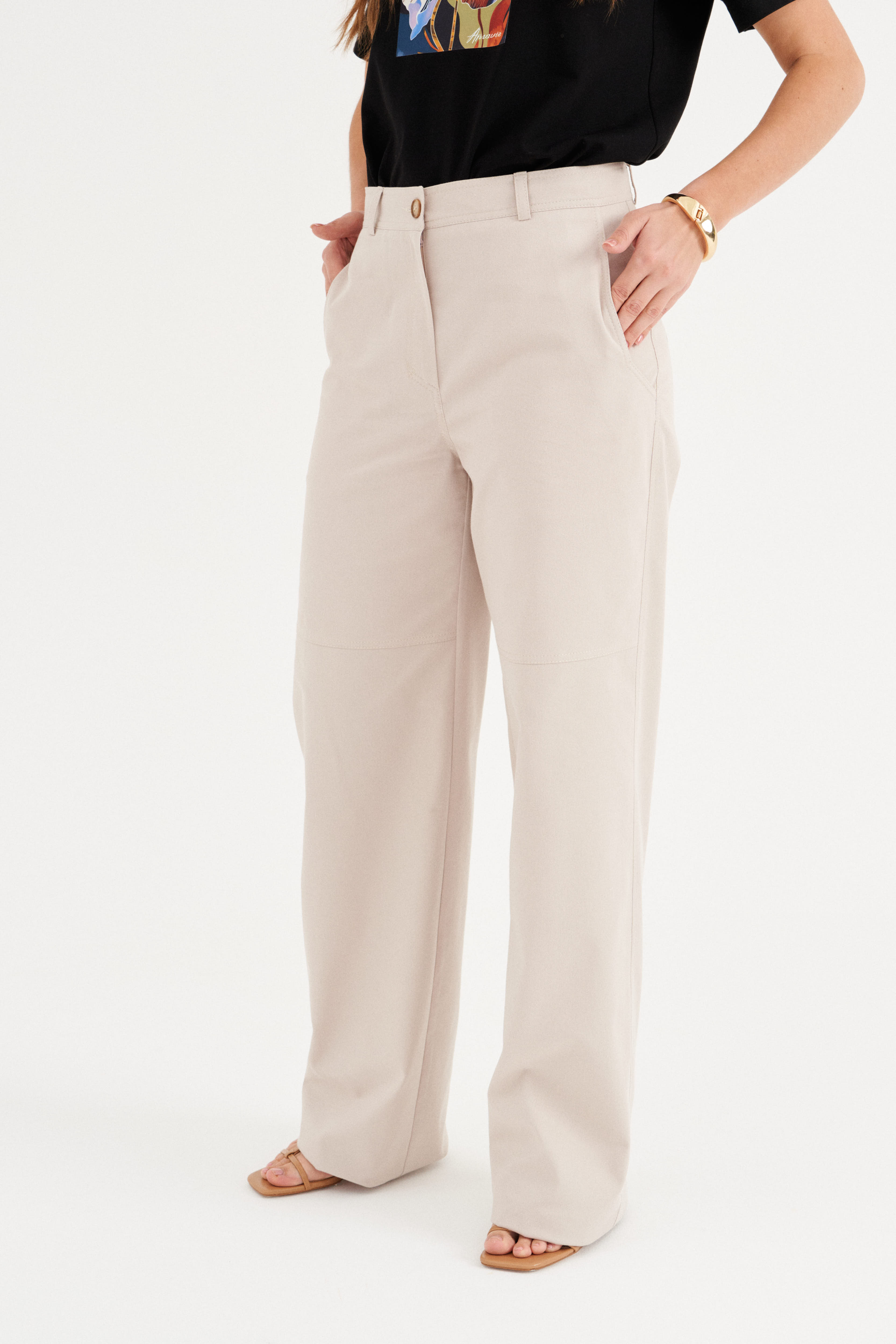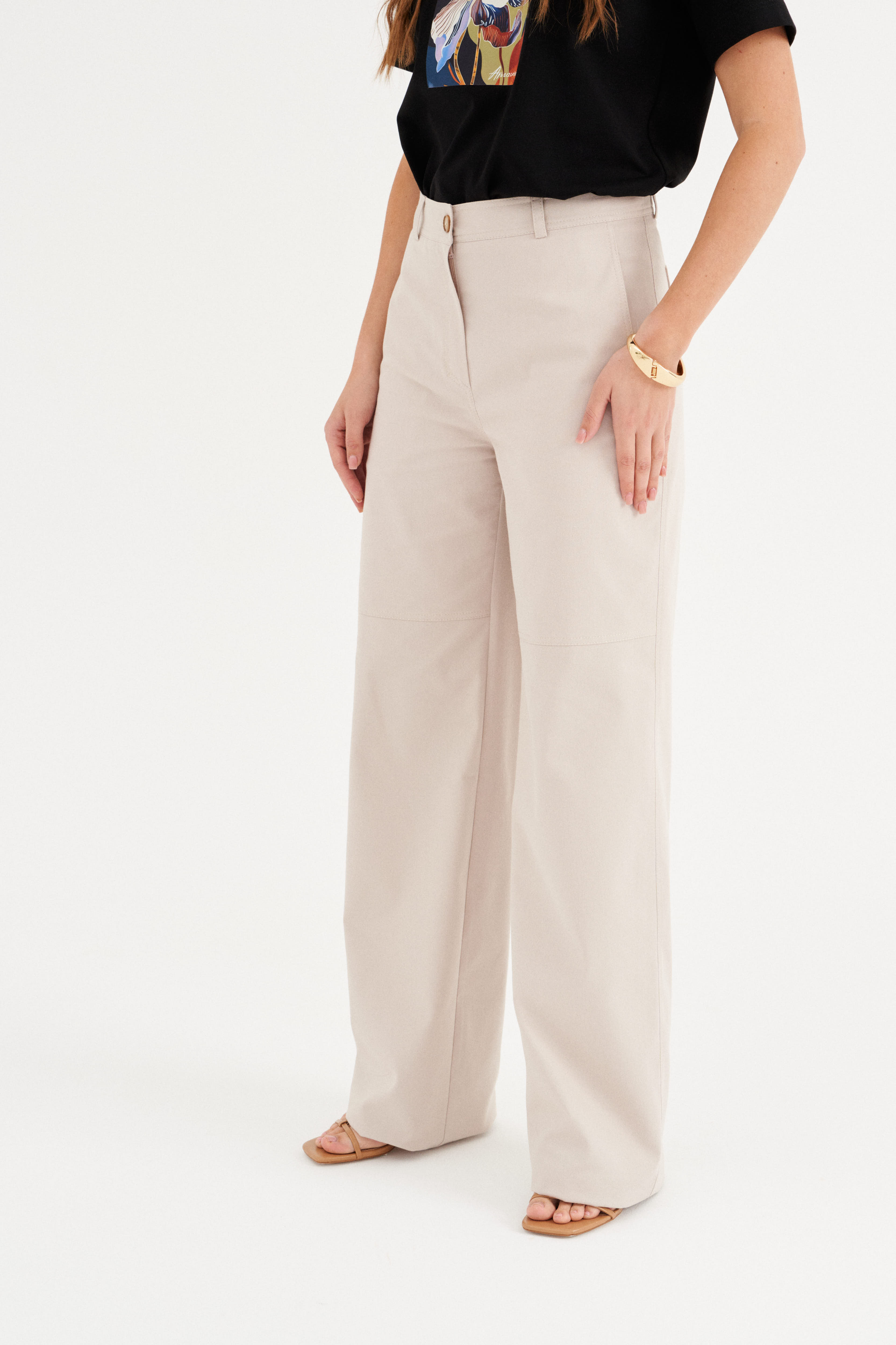 - Брюки из хлопковой ткани, полной длины, прямого свободного силуэта.