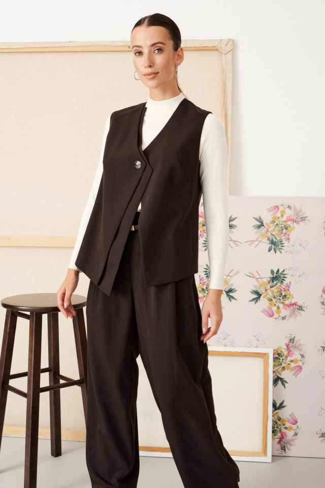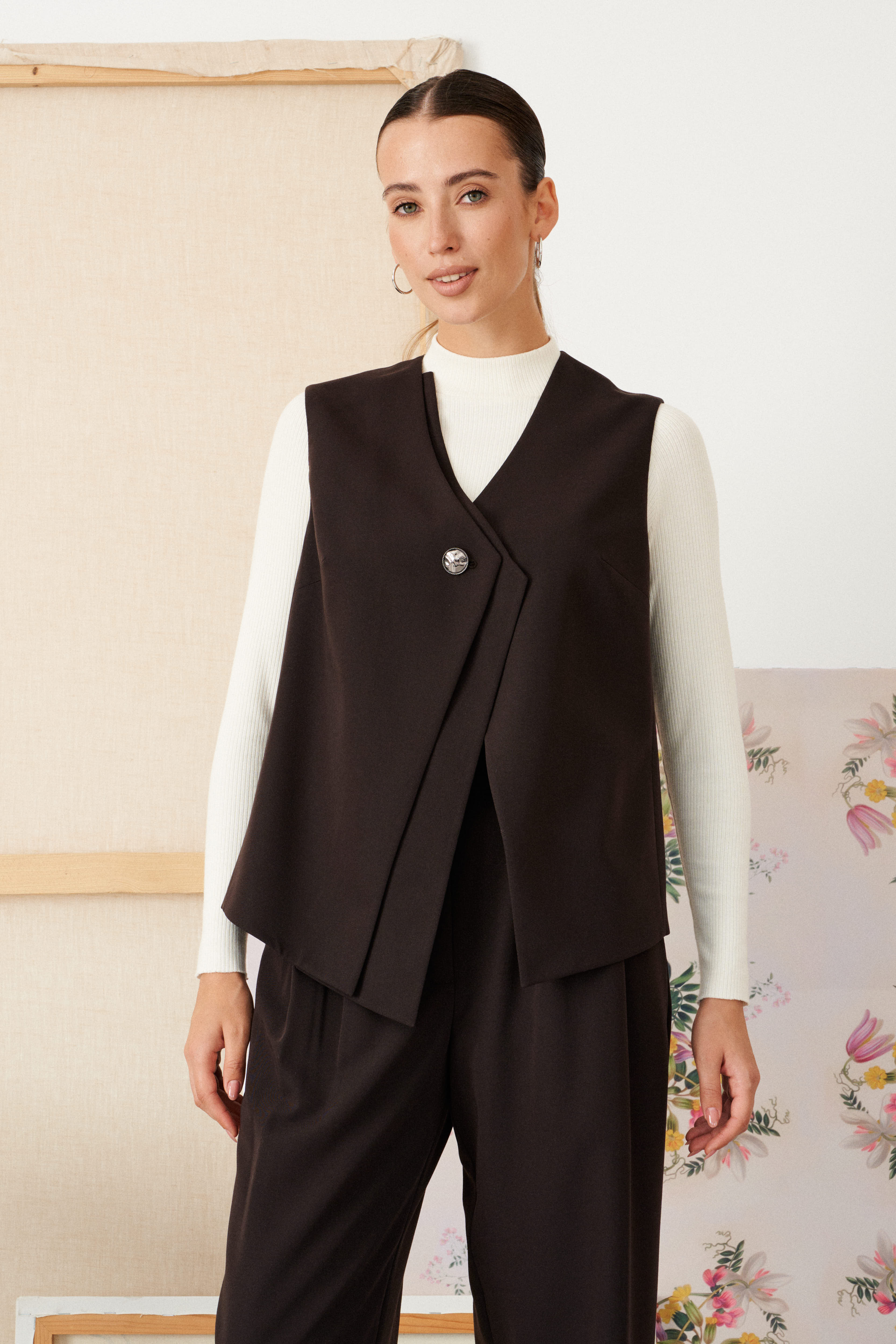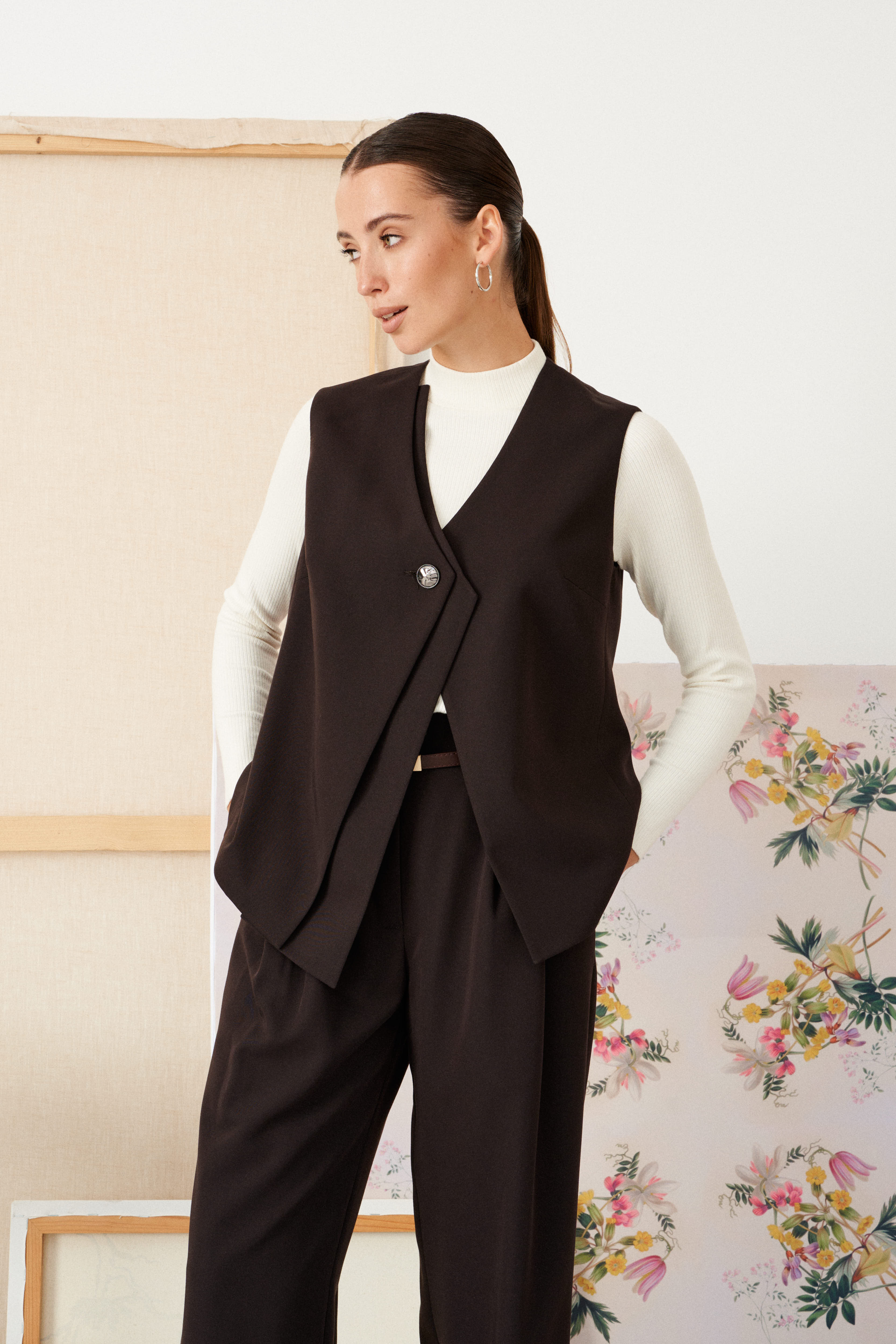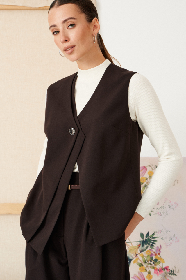 - По переду V-вырез, застежка на 1 пуговицу с возможностью застегнуть жилет на обе стороны, и отделочная деталь.