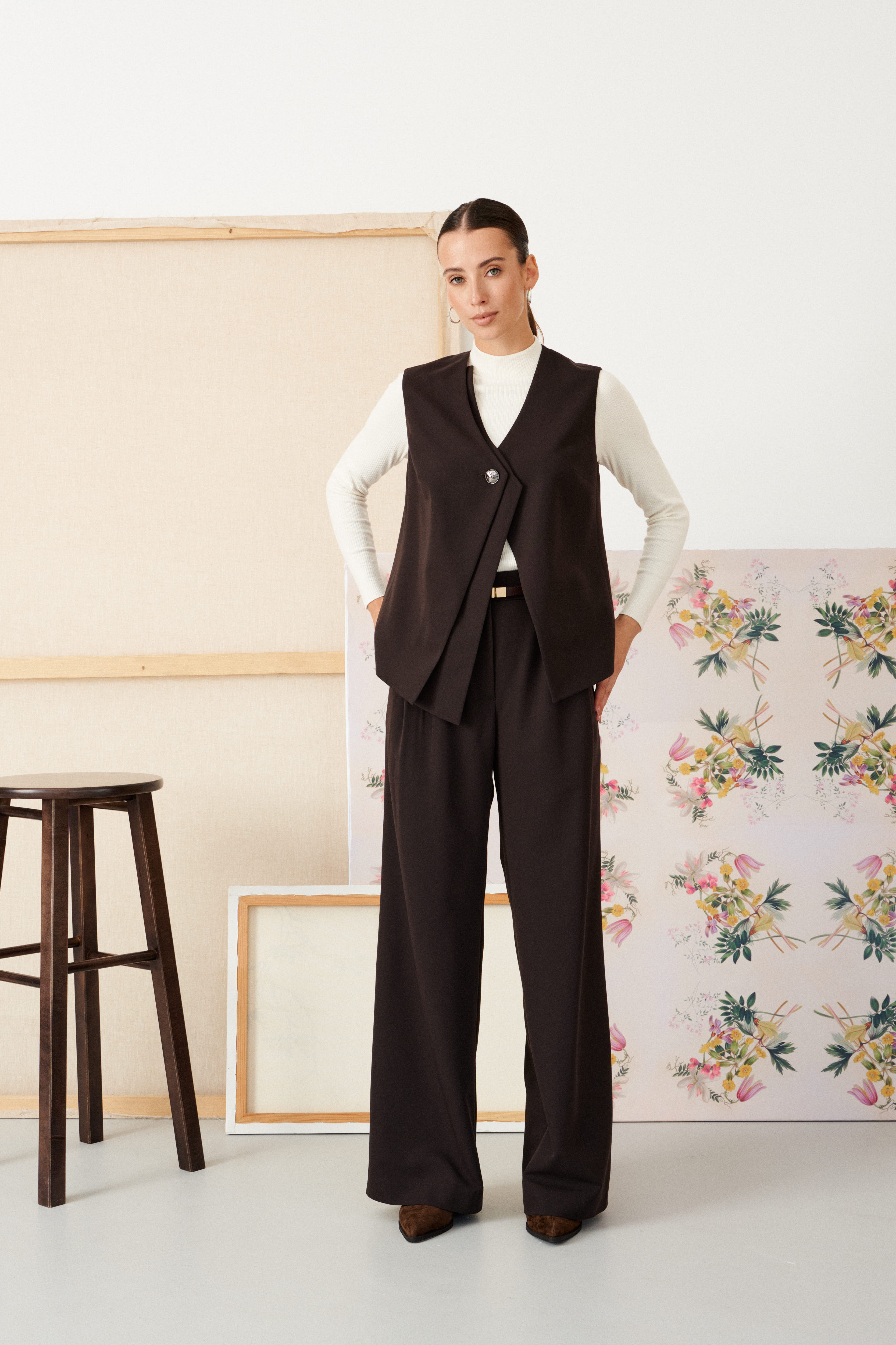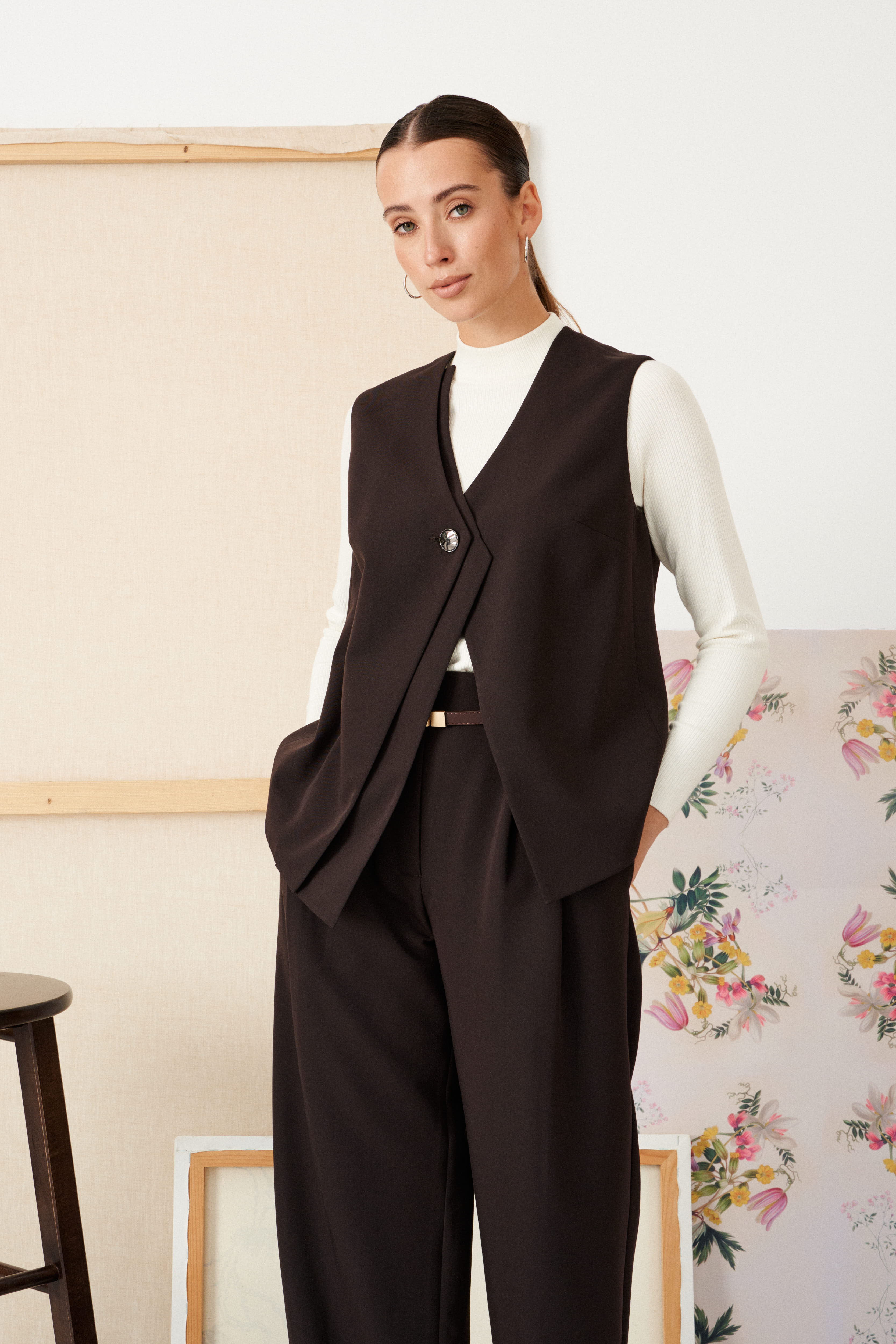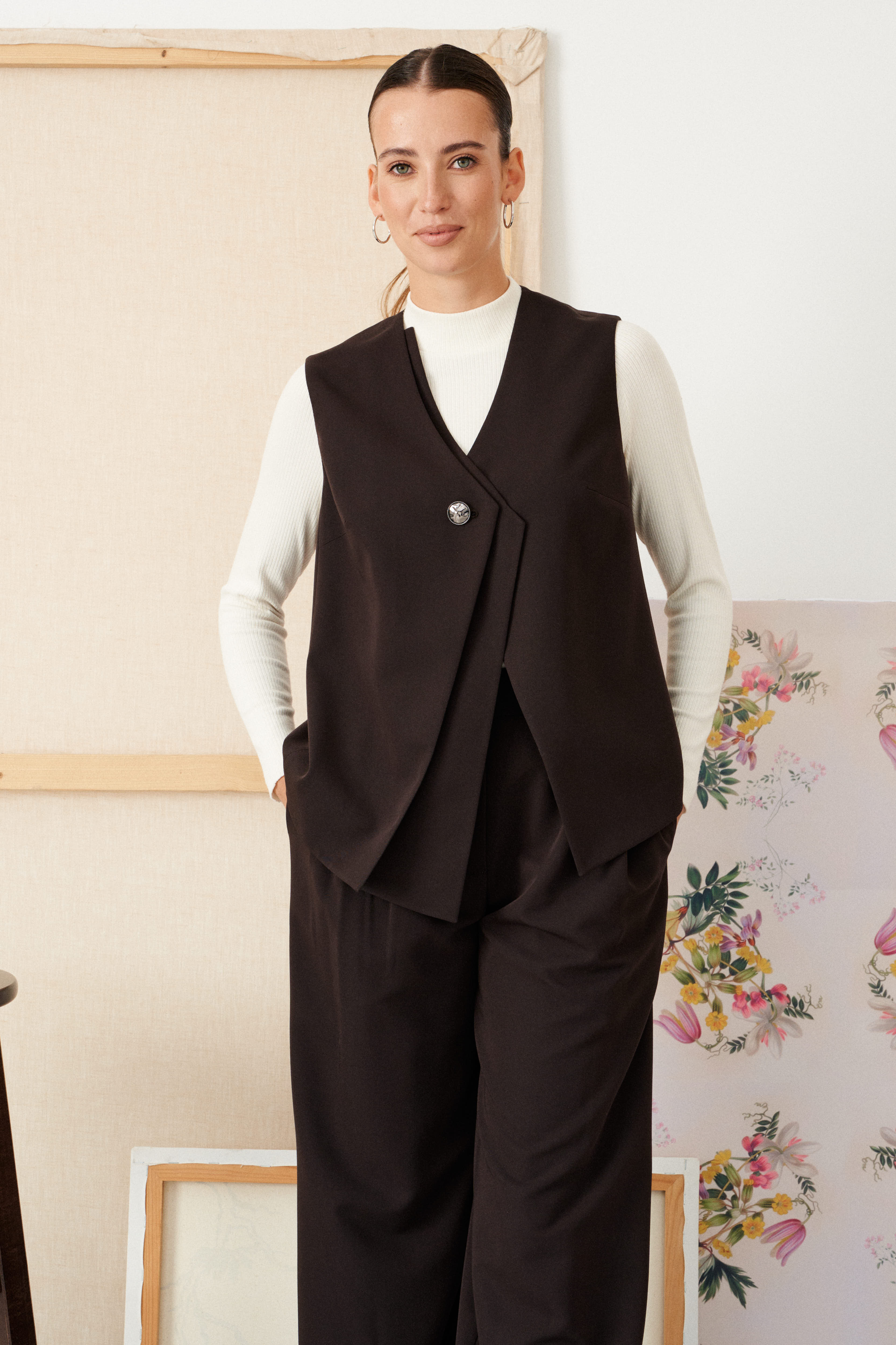 - По переду V-вырез, застежка на 1 пуговицу с возможностью застегнуть жилет на обе стороны, и отделочная деталь.