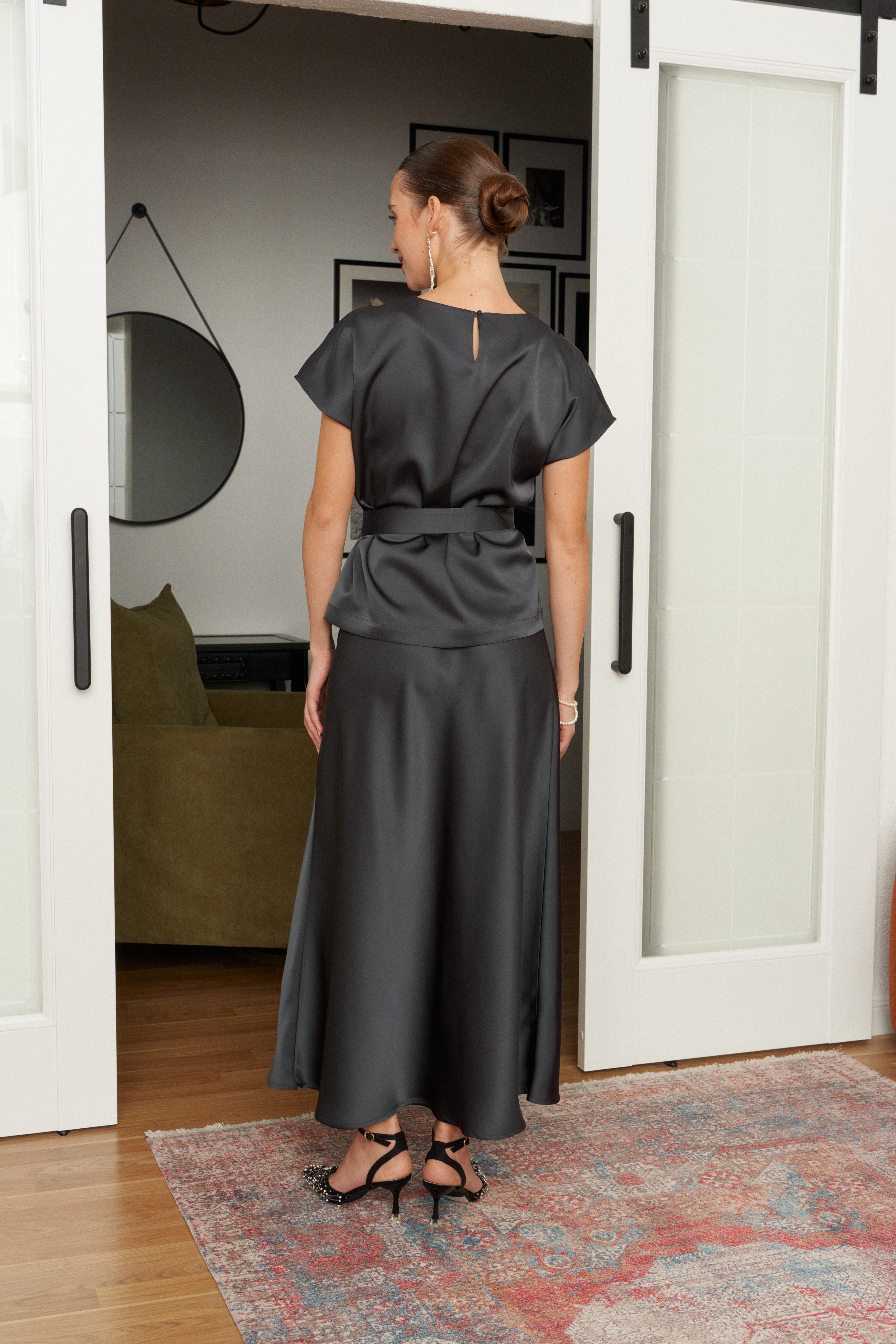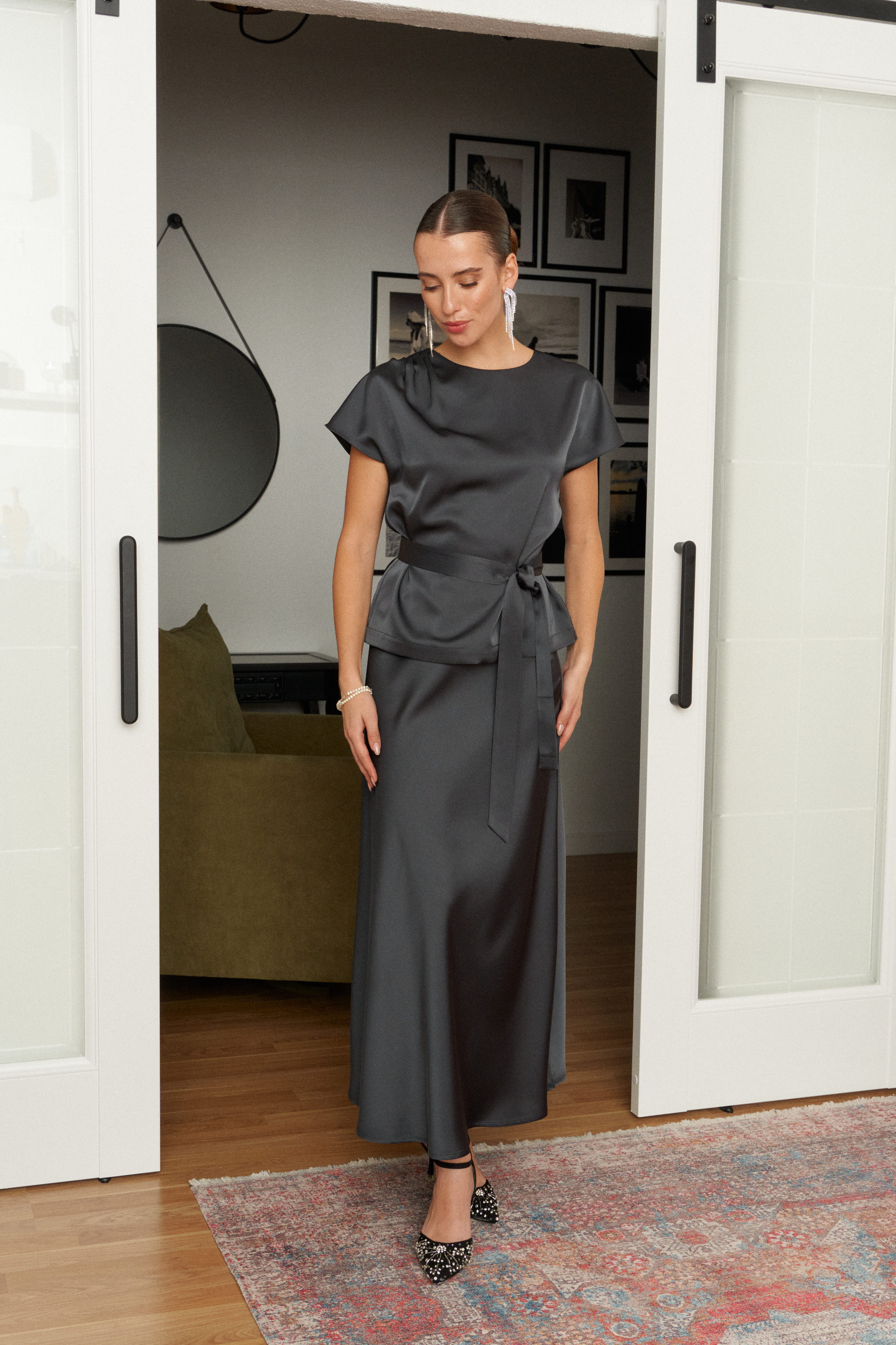 Юбка из атласной ткани, А-силуэта, длиной мидакси. Пояс на резинке.