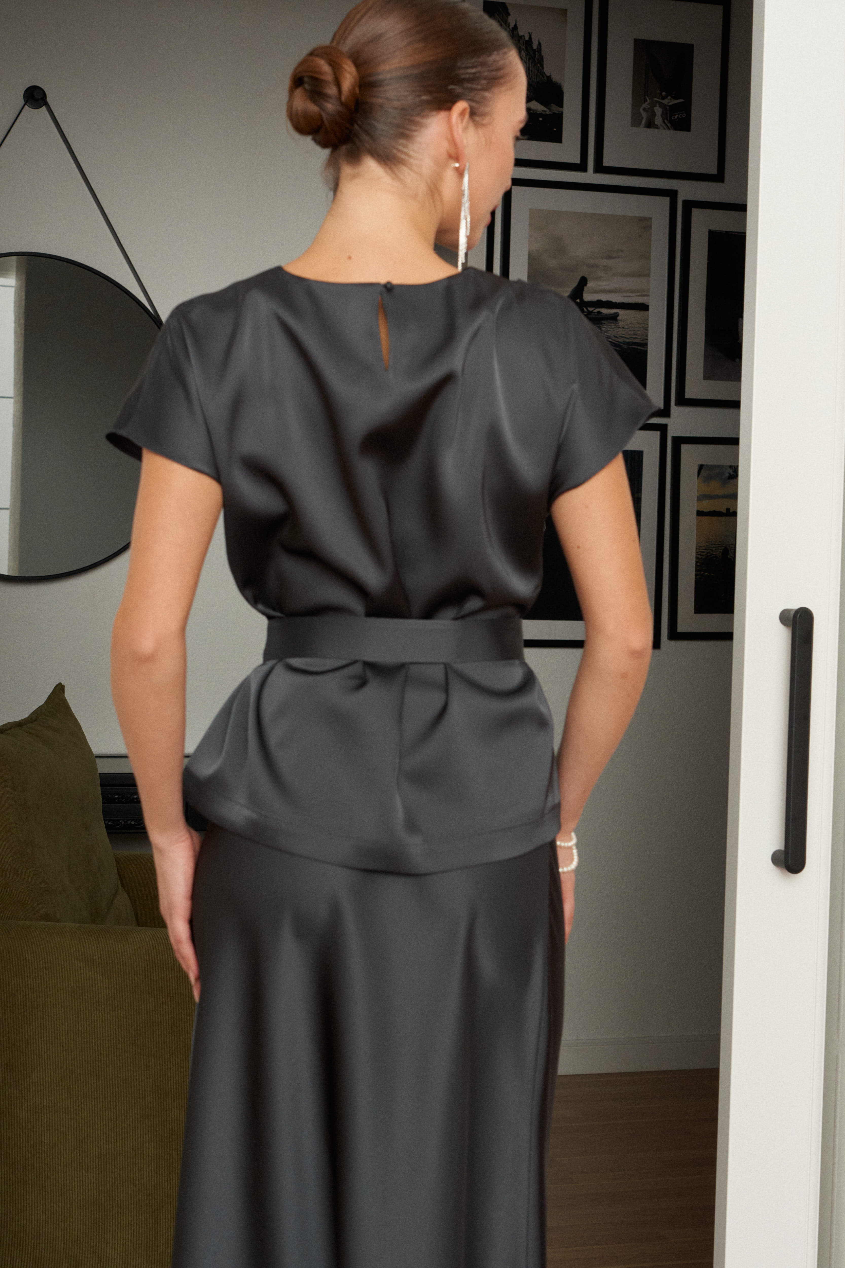 Блузка из атласной ткани, прямого свободного силуэта, длинной до линии бедер. Вырез горловины круглый, по спинке застежка - навесная петля с пуговицей. На правом плече по переду заложены складки. Имеется съемный завязывающийся пояс.