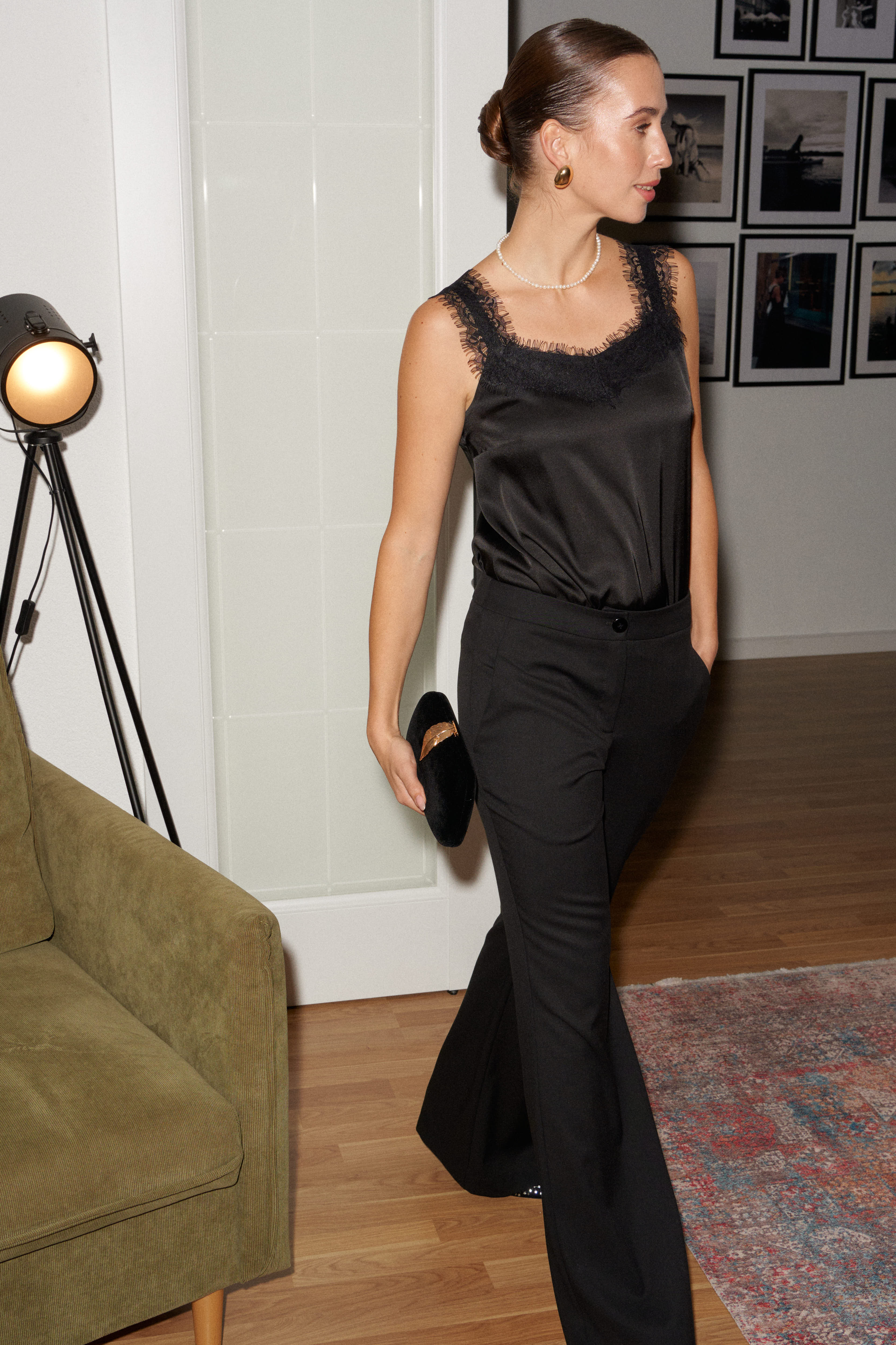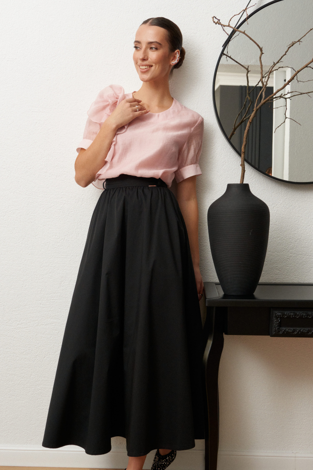 Брюки из поливискозной ткани, полной длинны, расклешенные от колена. По переду выполнены карманы с отрезным бочком. Пояс фигурный, обтачной.