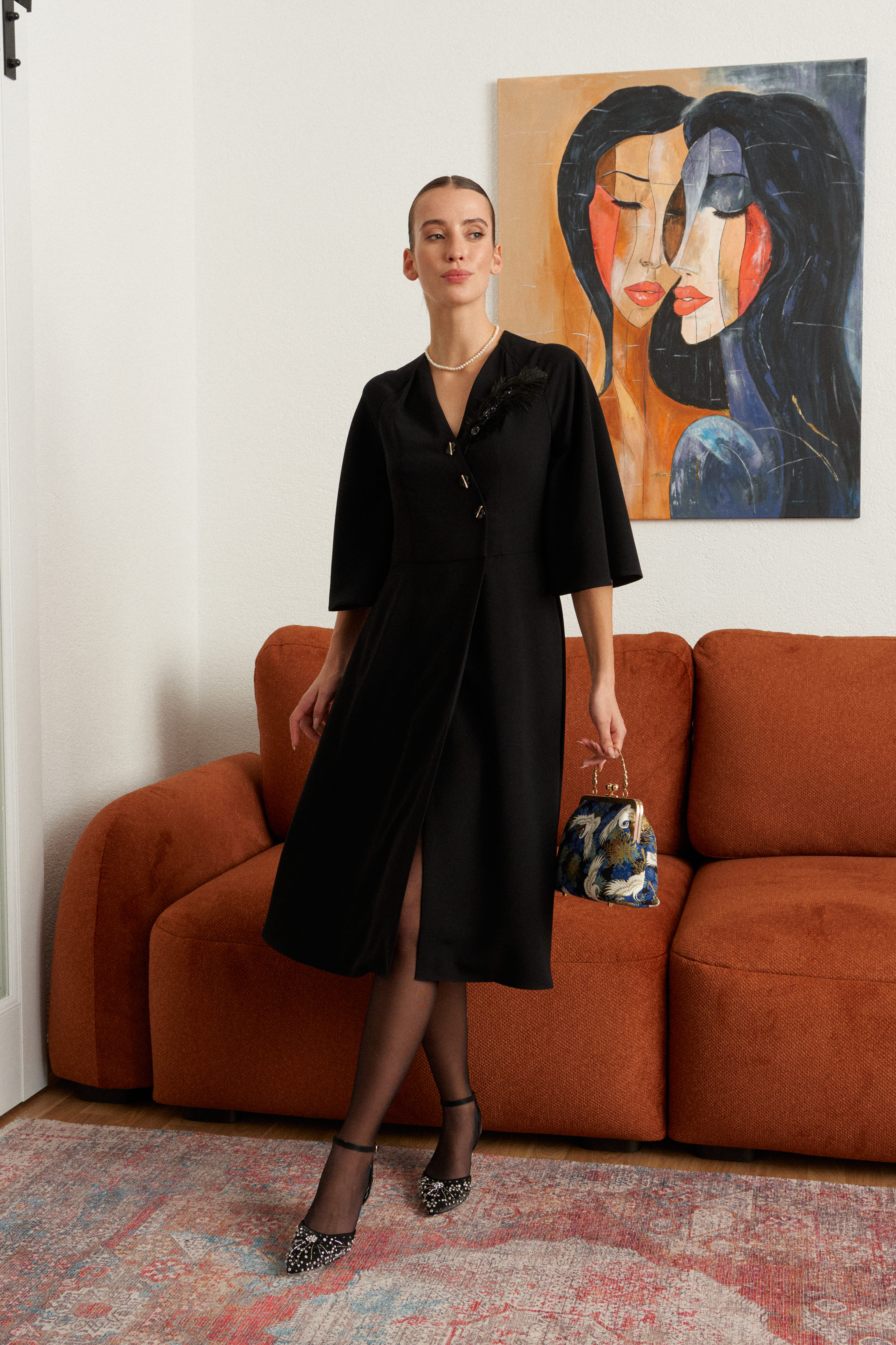 Платье из плательной ткани,длиной за колено,отрезное по линии талии,юбка А-силуэта.По спинке средний шов и талиевые вытачки,вырез V- образной формы.Рукав покроя реглан,длиной за локоть,расширенный к низу.Перед на запАх на петли/пуговицы с талиевыми вытачками и нагрудной вытачкой от линии реглана.Лиф платья на подкладке.