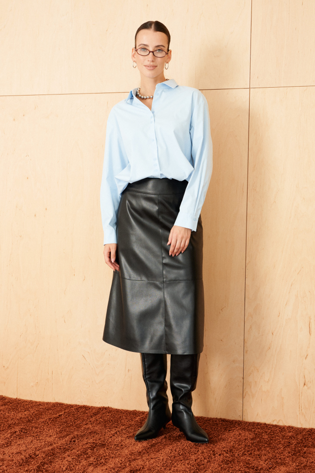 - Брюки полной длины, расширенного силуэта из костюмной ткани.