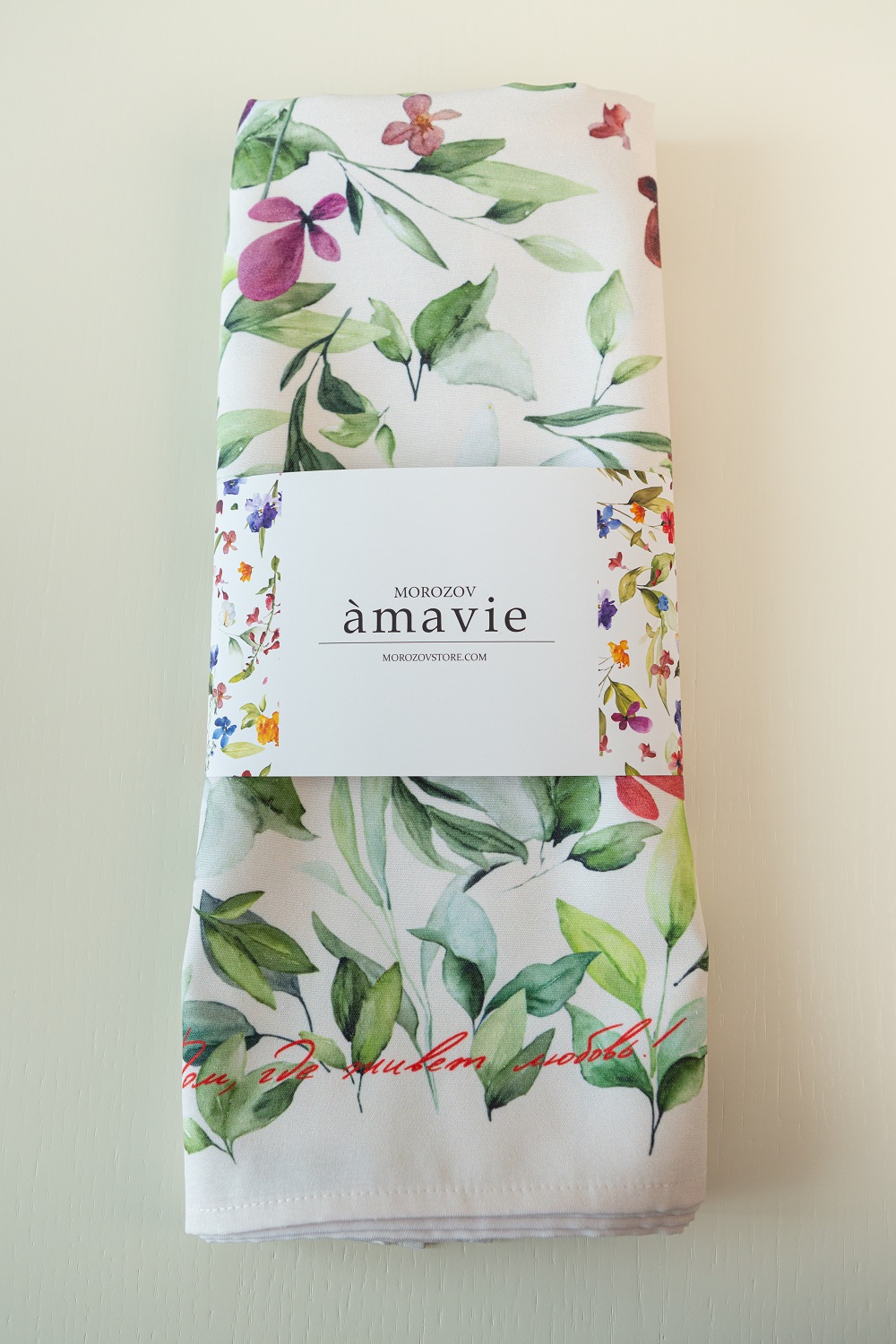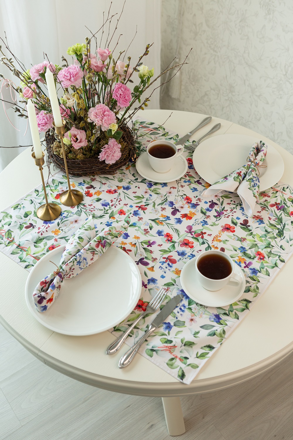 - Дизайн выполнен в весенней стилистике: принт с белорусскими полевыми цветами создает акцент на природных мотивах, органично вписываясь в различные форматы сервировки.